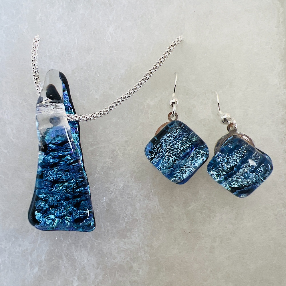 As the moon glimmers across the river the mystic blues and purples shine!  Captured in this fused glass pendant set by Jilly.  Complete with sterling silver chain and always gift wrapped
